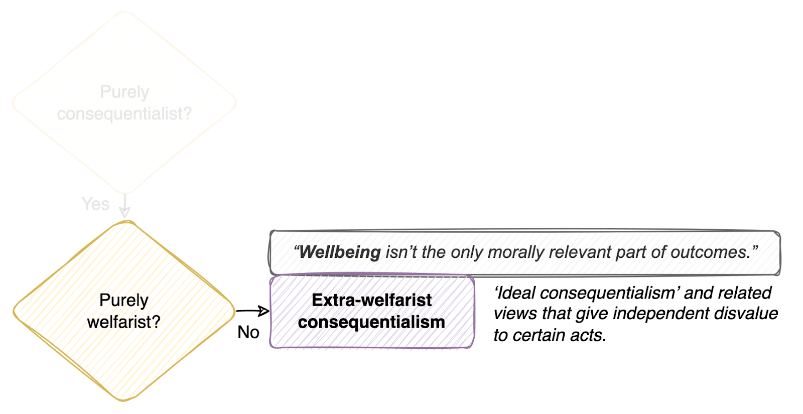 Views of wellbeing alone aren’t normative views: they don’t in themselves constitute any general principle for us to follow as a ‘criterion of rightness’ in our moral decision-making. They have normative implications for our actions only when combined with moral views whose criteria of rightness depend on wellbeing. For instance, welfarist consequentialism says that wellbeing outcomes alone determine the rightness of actions, with all other factors — such as intentions, rules, or virtues — being morally relevant only insofar as they affect the wellbeing outcomes.