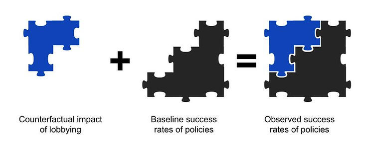 It is helpful to think of policy success as the sum of two components (Figure 2). Firstly, there is the baseline success rate of policies (grey puzzle piece). This might represent the general probability of success for a bill to pass without any additional effort from interest groups. Secondly, there is the counterfactual impact of lobbying (blue puzzle piece). This might correspond to the additional probability of success that can be attributed to extra lobbying effort. These two components both make up the overall, observed rates of policy success⁵.