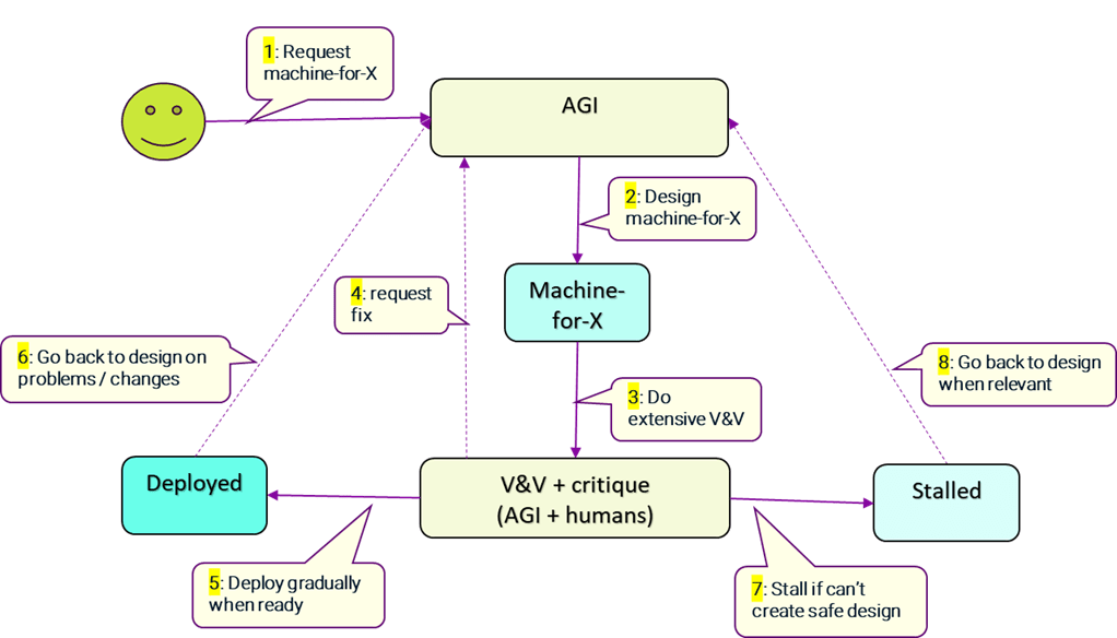 The V&V Method is a concrete, practical framework which can complement several alignment approaches. Instead of asking a nascent AGI to “do X,” we instruct it to design and rigorously verify a bounded “machine-for-X”. The machine (e.g. an Autonomous Vehicle or a “machine” for curing cancer) is prohibited from uncontrolled self-improvement; every new version must re-enter the same verification loop. Borrowing from safety-critical industries, the loop couples large-scale, scenario-based simulation with coverage metrics and a safety case that humans can audit. Human operators—supported by transparent evidence—retain veto power over deployment.