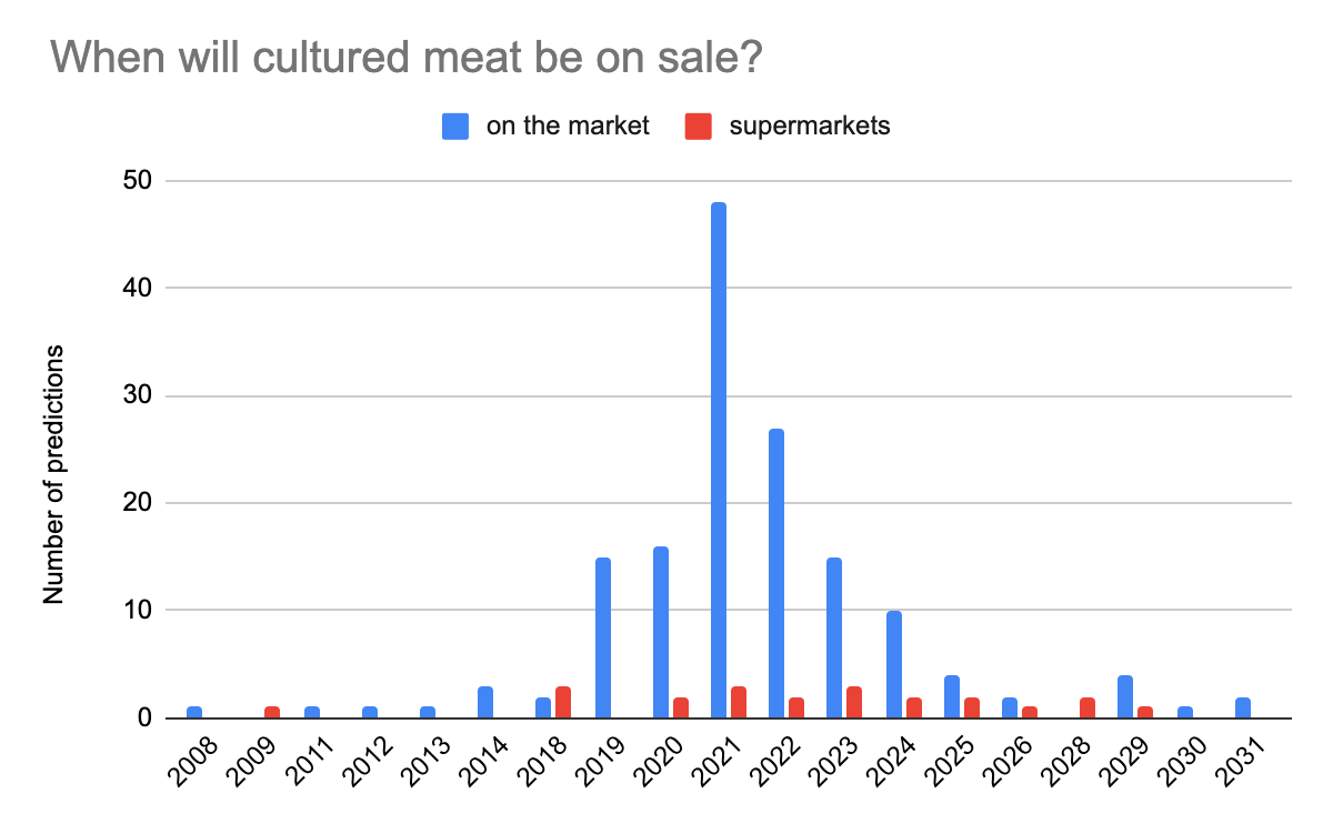 65 predictions made on cultured meat being available on the market or in supermarkets specifically can now be resolved. 56 were resolved negatively and in the same directionâoverly optimistic (update: the original post said 52). None resolved negatively for being overly pessimistic. These could resolve differently depending on your exact interpretation but I donât think there is an order of magnitude difference in interpretations. The nine that plausibly resolved positively are listed below (I also listed nine randomly chosen predictions that resolved negatively).