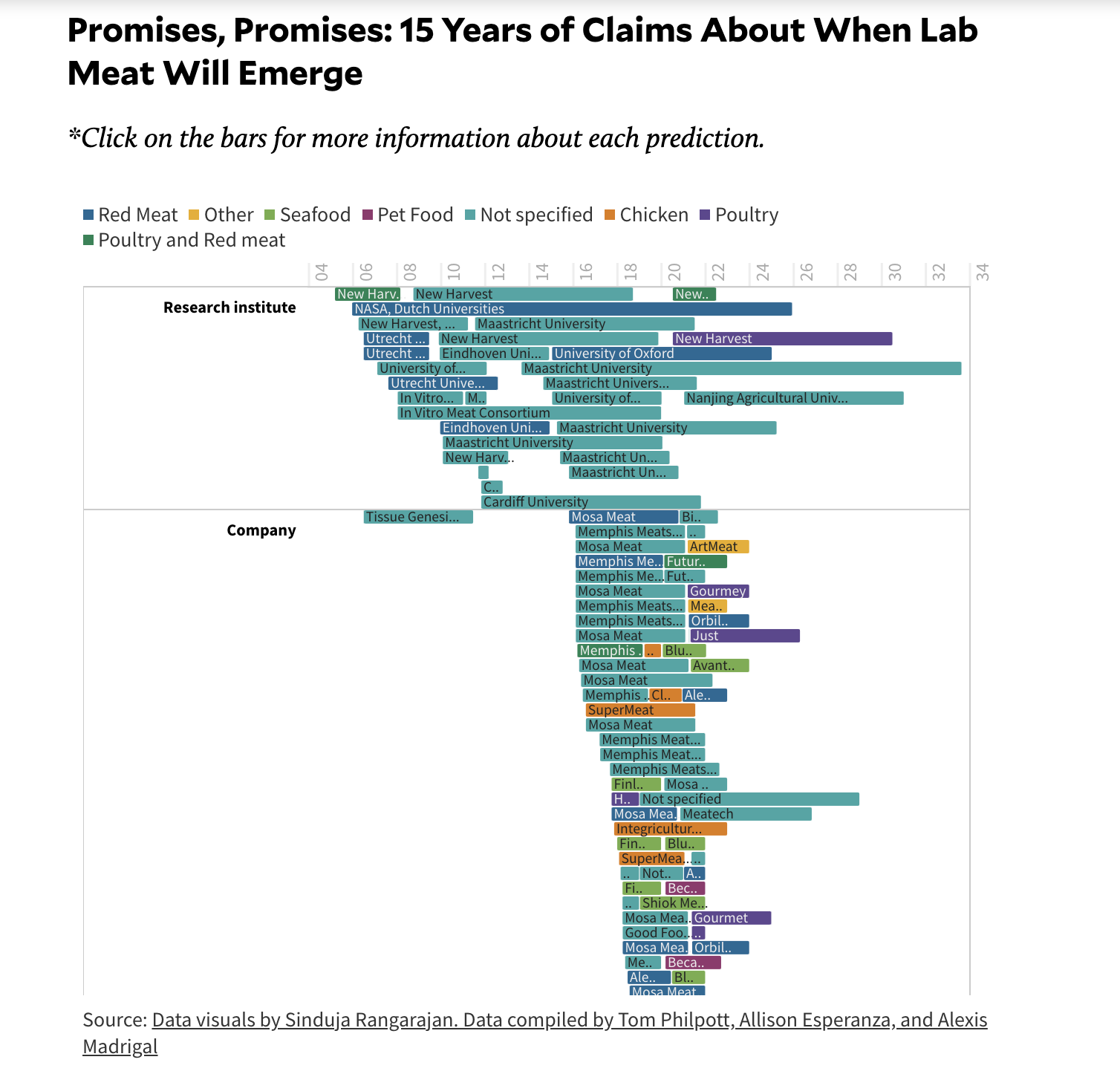 In a 2021 MotherJones article, Sinduja Rangarajan, Tom Philpott, Allison Esperanza, and Alexis Madrigal compiled and visualized 186 publicly available predictions about timelines for cultured meat (made primarily by cultured meat companies and a handful of researchers). I added 11 additional predictions ACE had collected, and 76 other predictions I found in the course of a forthcoming Rethink Priorities project.