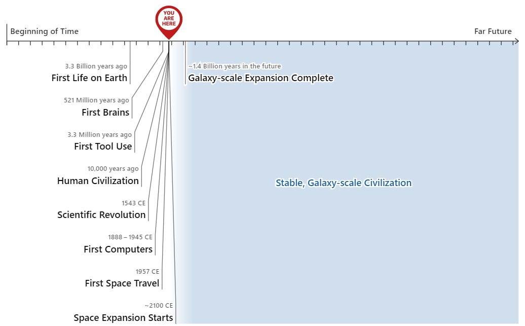 Questo punto di vista sembra incredibile. Davanti a qualsiasi asserzione che viviamo in tempi così speciali, la reazione dovrebbe essere di pensarci due volte. Mostro questo rappresentando la storia della nostra galassia con una linea del tempo. (A livello personale, questa incredulità è probabilmente la ragione principale per cui, per molti anni, sono rimasto scettico sui ragionamenti di questo tipo. Asserzioni tali sull’importanza dei tempi in cui viviamo sembrano così incredibili da suscitare sospetti).