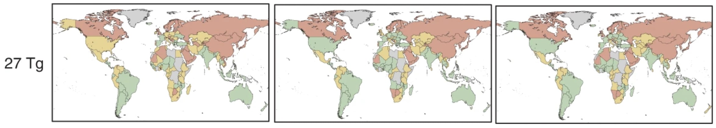 Another important dynamic is the different climatic impacts across countries. Here are the results from Fig. 4 of Xia 2022 for the 27 Tg scenario (closest to the 30 Tg expected by Luísa):