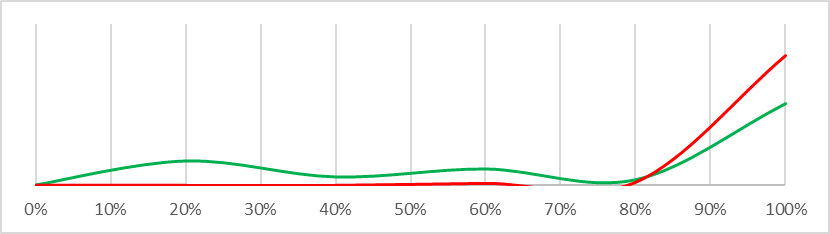 In the diagram below I have colour-coded the diagram above to make this point. The red area are draws which are low enough that they make a difference to the overall result (<10%), the orangey-yellow area are draws middling enough that they don’t really affect the final result on expectation and the green area are draws high enough that we might expect them to cancel out the draws in the low area (>90%)