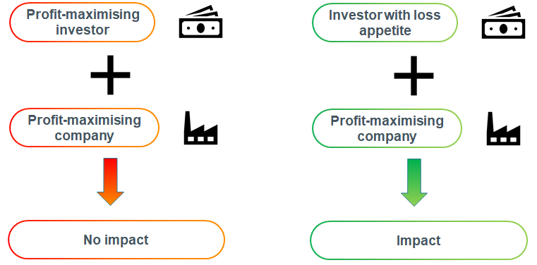 The investor can have impact if they are willing to achieve below-market returns (i.e. have a loss appetite) on that asset. And because the asset generates externalities which hit the rest of the portfolio, tactically incurring below-market returns on that asset may lead to externalities across the rest of the portfolio which lead to greater returns on a portfolio-wide basis.