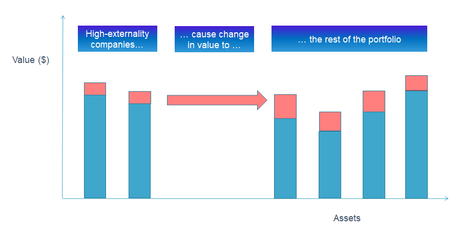 As an investor, if we influence the high-externality companies to make their externalities better, we can model the extent to which this improves the profitability of the rest of the portfolio – i.e. the investor can regain the red chunks in the diagram.
