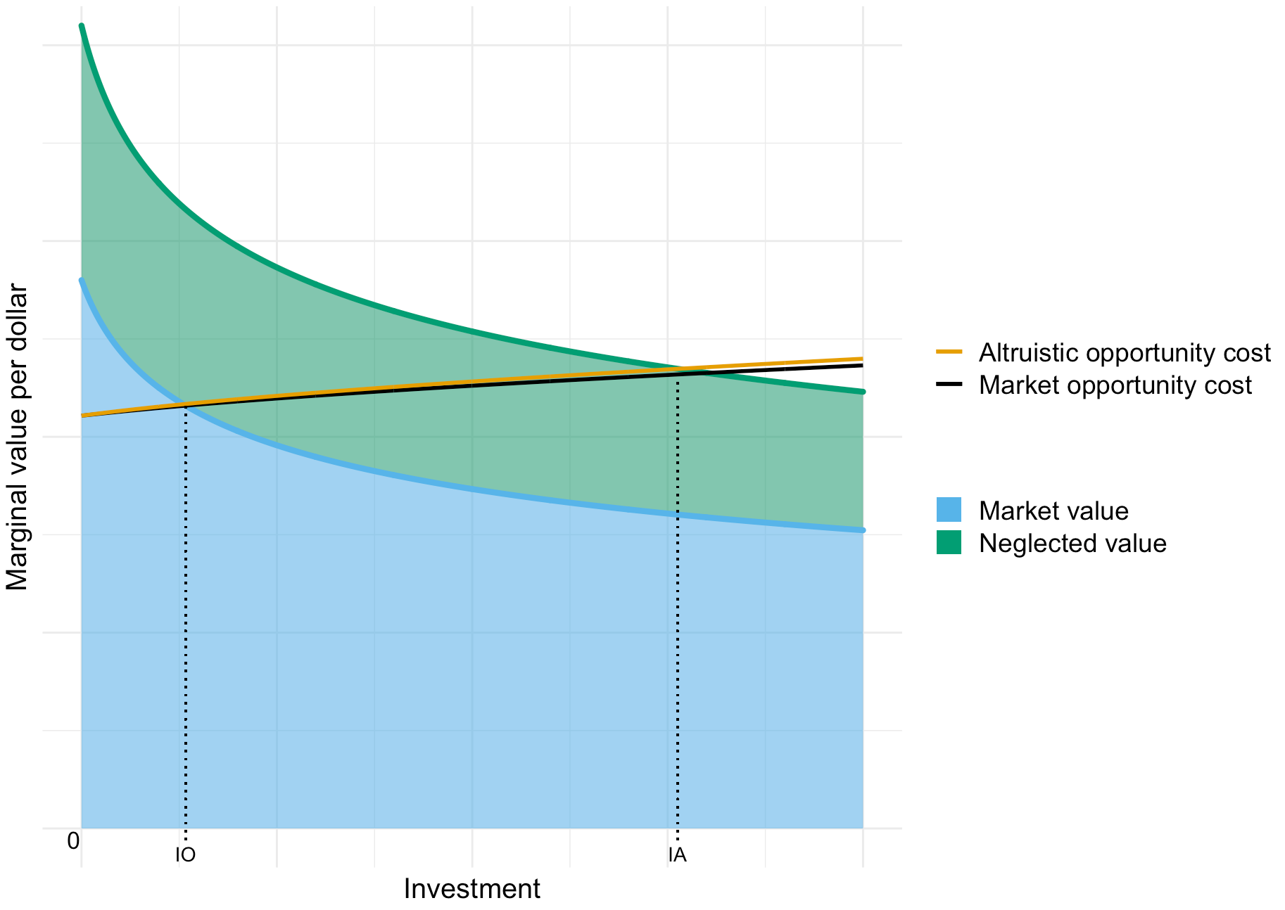If we ignored equilibrium effects, and assumed your opportunity cost was similar to the market’s, the net value per dollar created by your investment will be the neglected value per dollar at investment level IO.