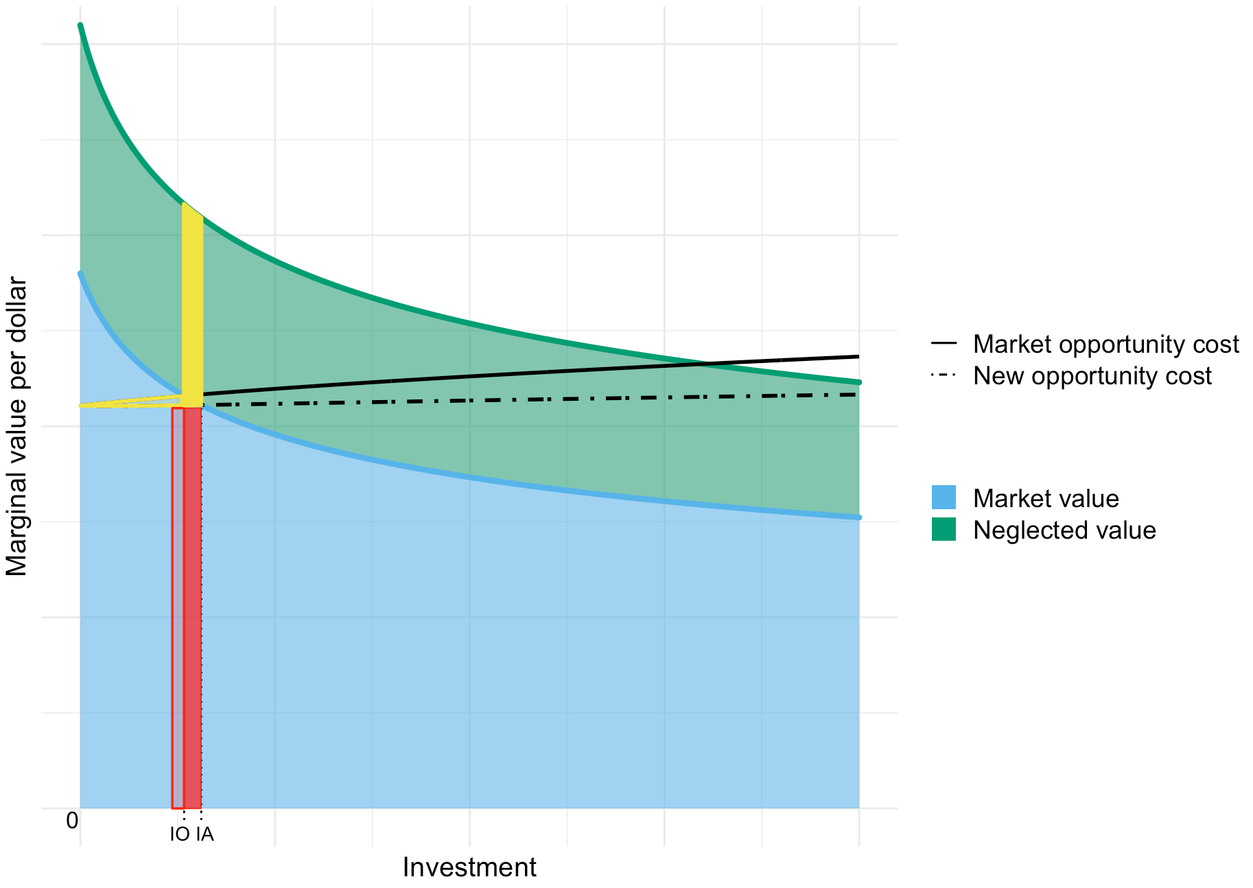 We can infer this value if we assume that the neglected values and market values have similar rates of diminishing returns to scale. Relative to the initial neglected value per dollar ‘G’ at zero investment, at IO it will be reduced by the ratio of ‘A’, the market value per dollar at zero investment, and the opportunity cost level ‘OC’ at IO. Thus the neglected value per dollar will be