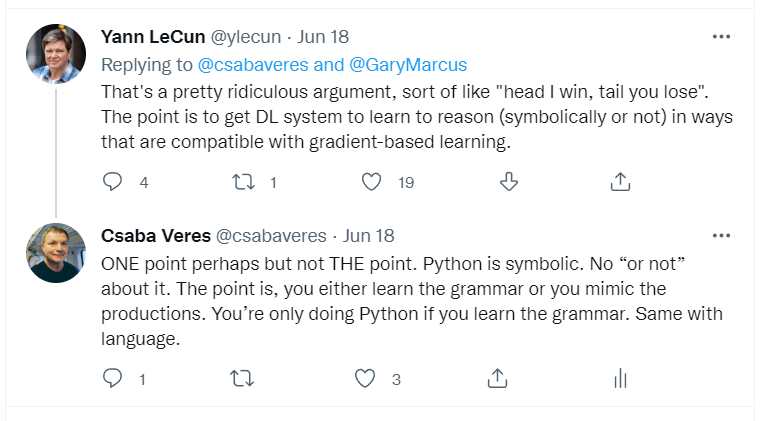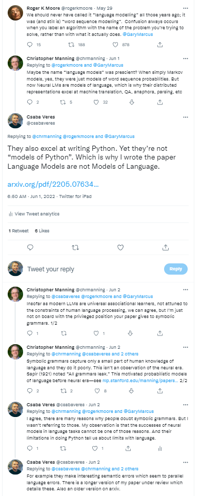 In another discussion with Christopher Manning, an influential NLP researcher at Stanford, I debate the plausibility of DL as models of language. As opposed to LeCun, he actually takes my argument seriously, but drops out when I show that his position is not winnable. That is, the fact that “Language Models” learn Python proves that they are not models of language. (The link to the tweets is https://​​twitter.com/​​rogerkmoore/​​status/​​1530809220744073216?s=20&t=iT9-8JuylpTGgjPiOoyv2A)