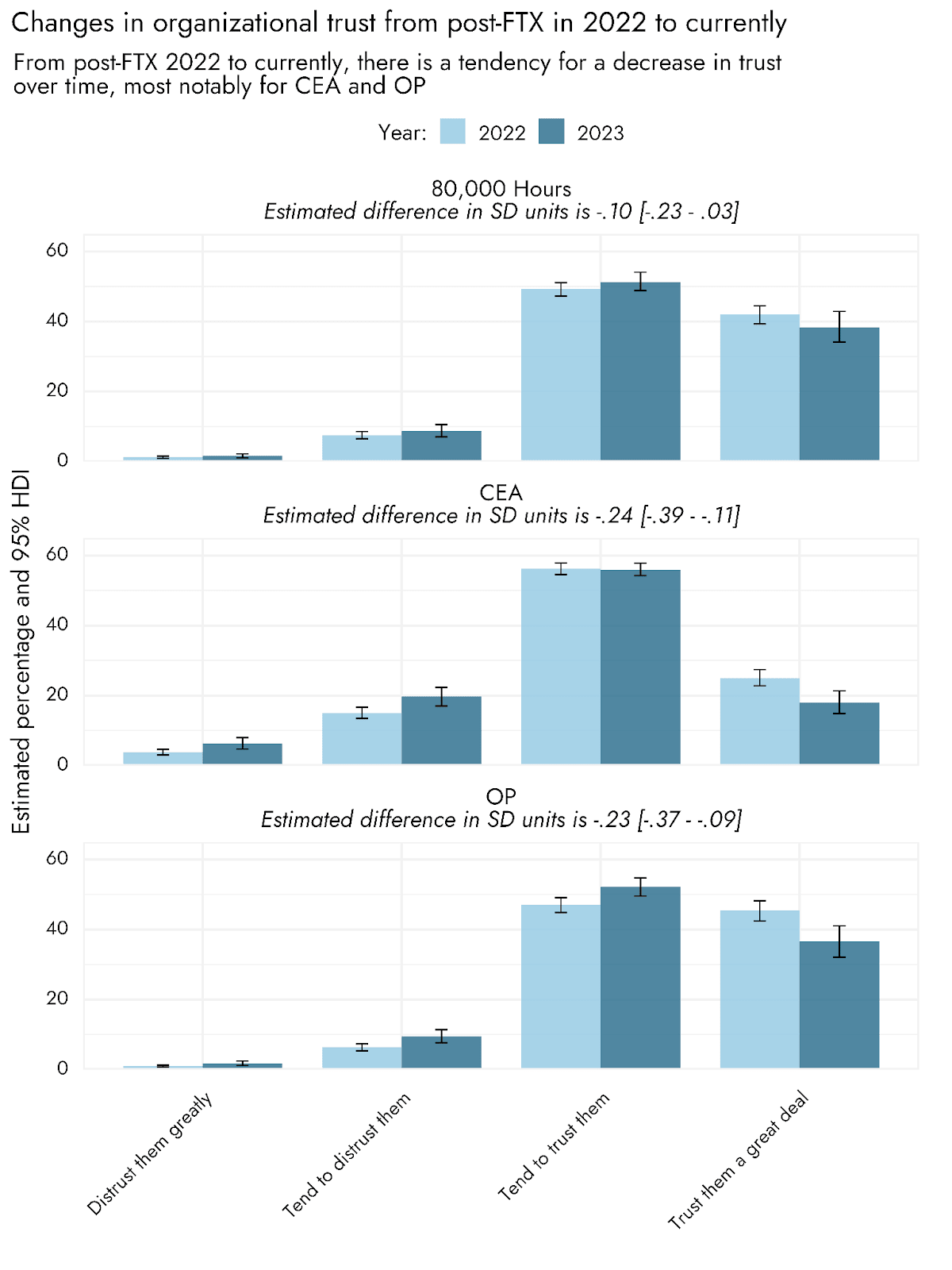 We were also able to assess estimates of trust in these organizations currently, relative to when these questions were first asked in the recent aftermath of the FTX collapse in 2022. There were not a sufficient number of respondents to match, so we have simply compared all the responses from 2022 with all those of this most recent supplemental survey. Results for both OP and CEA evinced a decline in trust, with 80,000 Hours tending in this direction but not reliably excluding an absence of any change over time.
