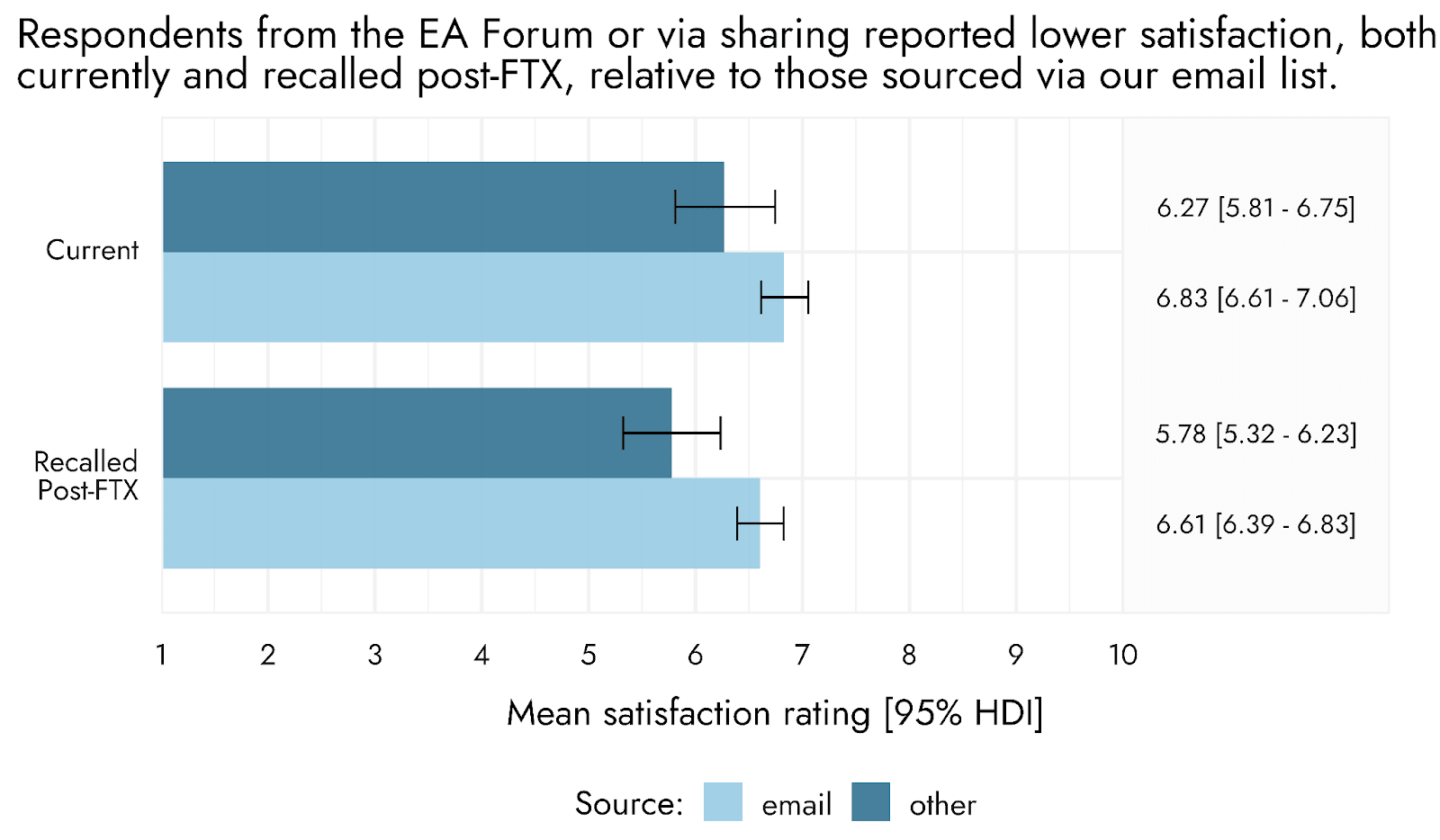 Comparing satisfaction levels of all respondents who completed the survey in 2022 (post-FTX) to all those who completed this followup survey at the end of 2023, we see a decrease in satisfaction (-.22 [-.41 - -.05] on the satisfaction scale, or d = -.13 [-.23 - -.02]). Comparing reported satisfaction only for respondents who we could individually match across both surveys, we likewise observed a decrease (-.41 points [-.86 - -.01], d = -.26 [-.53 - .01]).[3]
