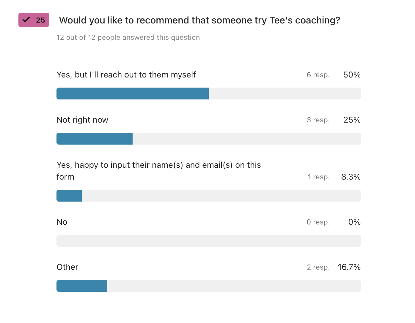 As someone who has known him for a fair while, one thing I think this post doesn’t quite do justice to is how genuinely lovely and helpful Tee is. Coaching—like therapy—gets a lot of its efficacy from the relationship between coach and coach-ee, and so I’m not surprised by the positive feedback showcased above.