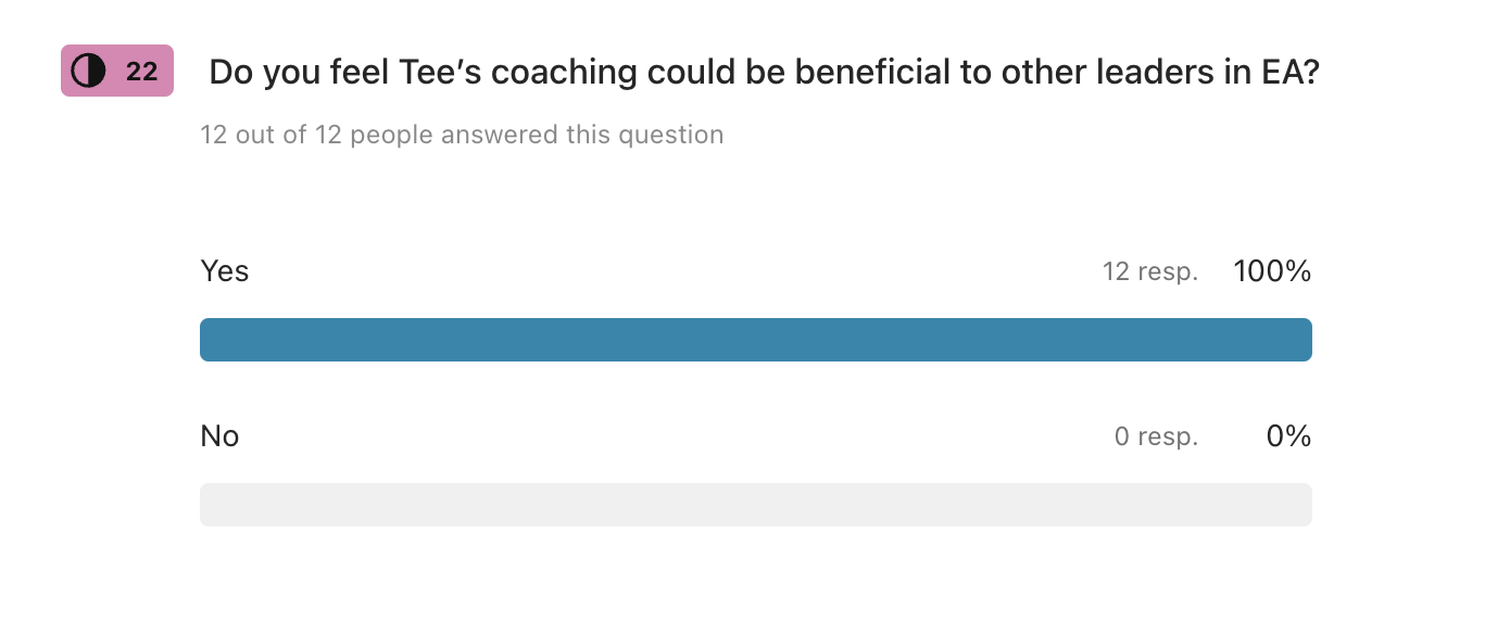 I find the results mindblowing—especially as it’s on people who are steering the trajectory of one of the more promising (youth) communities of our time. Even just the simple fact that people with so high opportunity cost on their time want to continue says a lot. In other words, if this is as good as it seems, one should prioritize providing this kind of coaching (or something similarly valuable) to all leaders within EA.