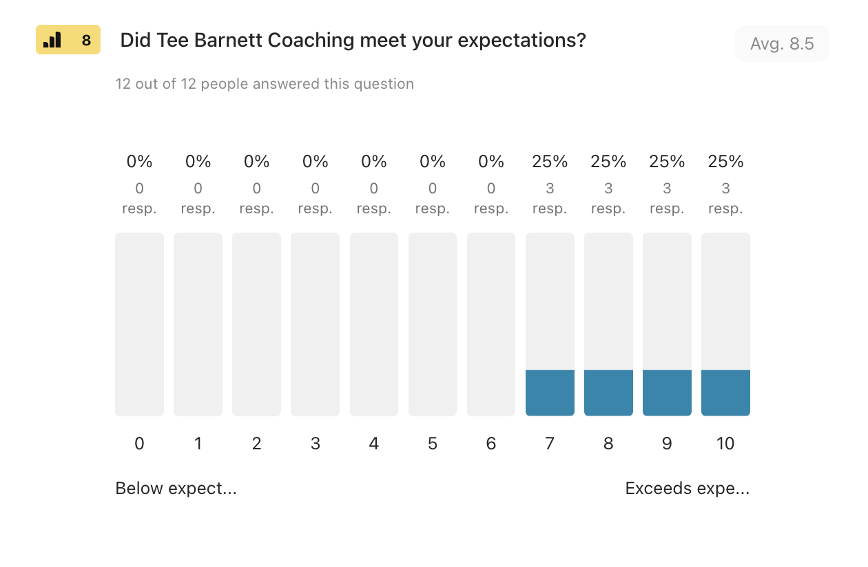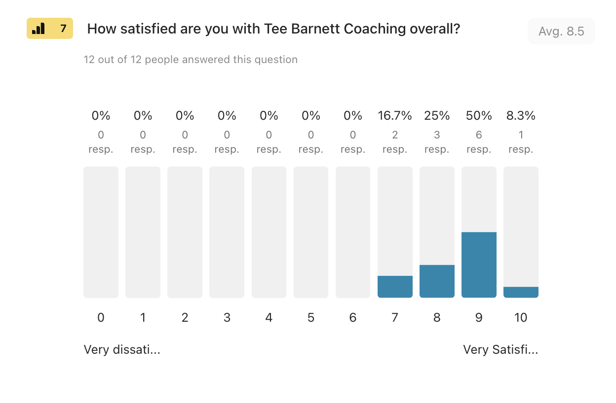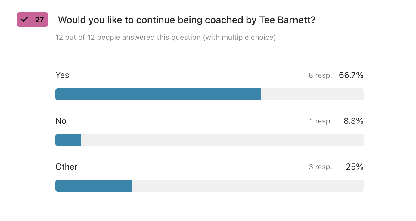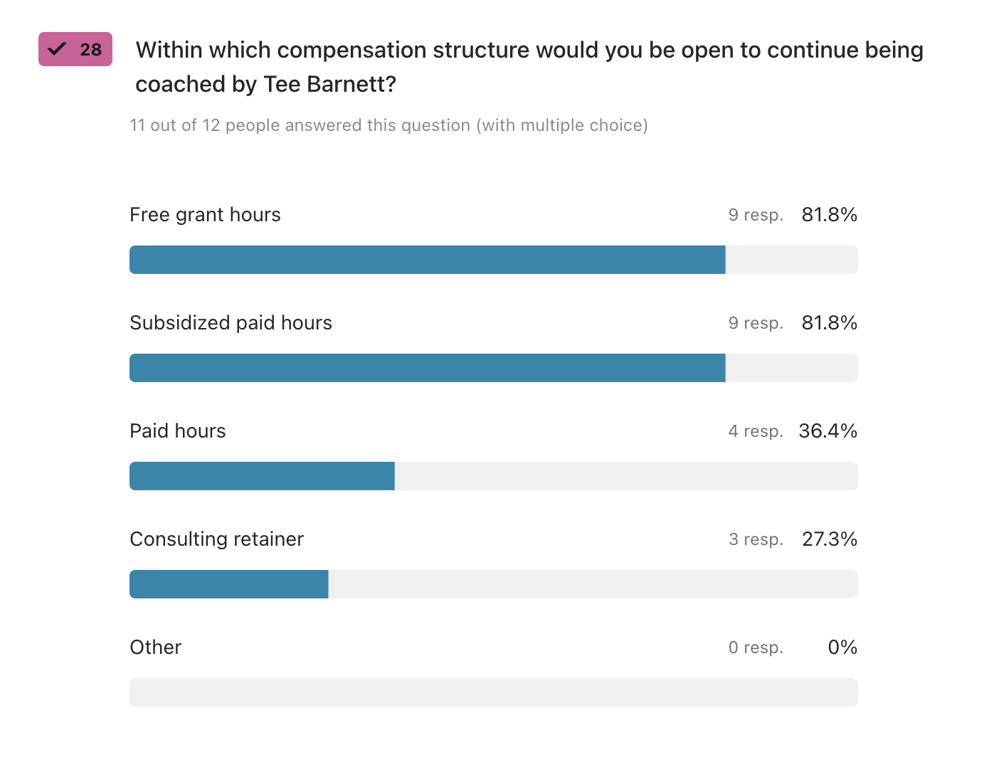 Post-trial demand – 11⁄12 feedback respondents indicated that they’d like to continue on with Tee Barnett coaching in one form or another after the trial. 10⁄12 indicated interest in continuing with a paid arrangement (column x), 4⁄12 signaled interest in non-subsidized (fully paid) sessions.