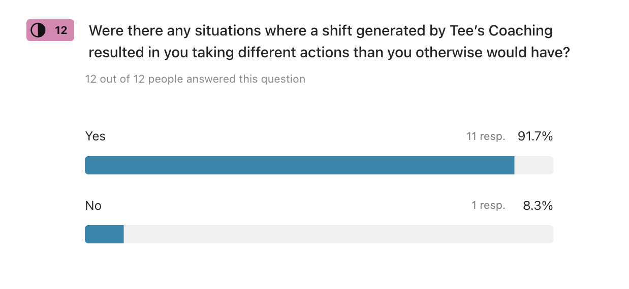 Recommendations for EA Leaders – 100% (12 of 12) reported that this coaching could be beneficial for EA leaders (see related public testimonials or jump to this section)