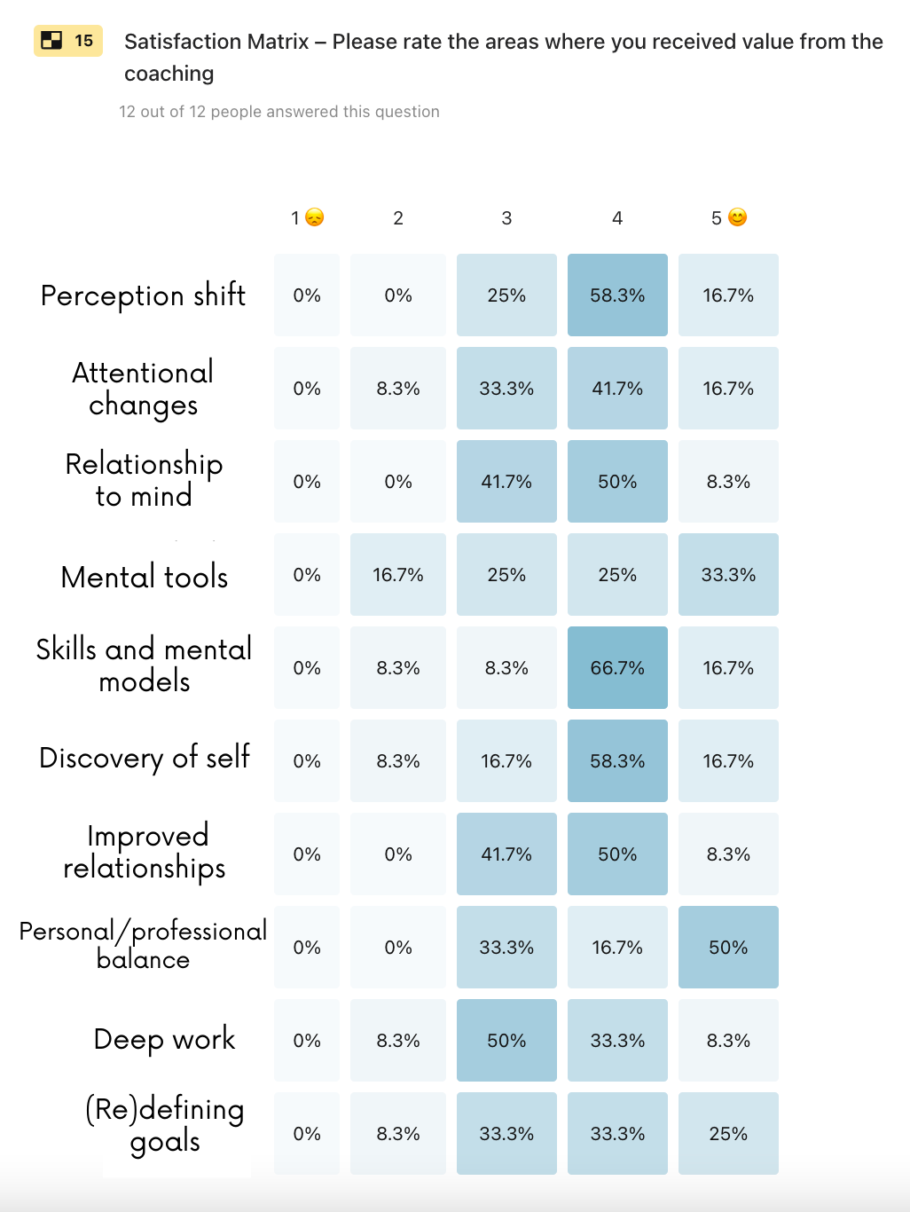 Satisfaction Matrix – Please rate the areas where you received value from the coaching