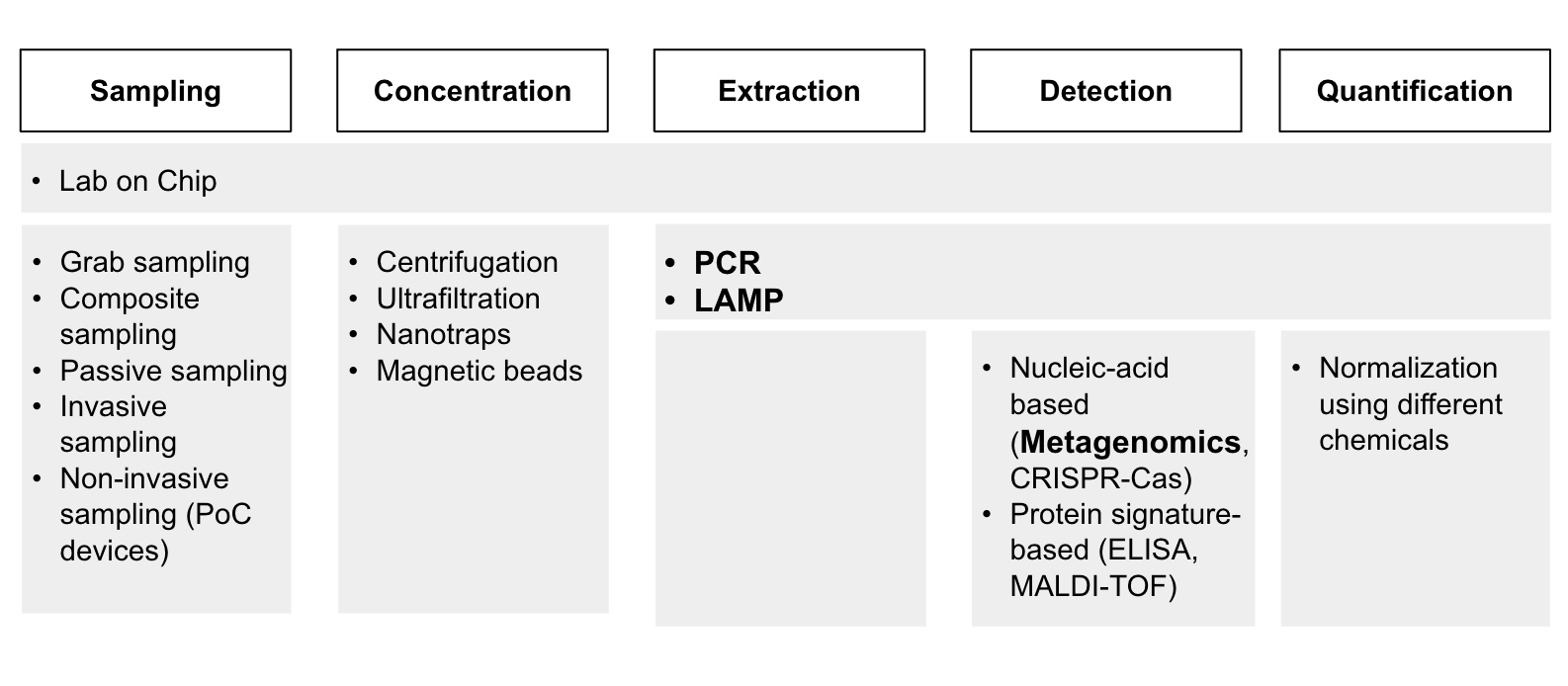 We identified a list of technologies commonly used in PoP, Clinical, and Environmental Surveillance across the sampling, concentration, extraction, detection and quantification stages. Due to the ten-week time constraint of the project, we narrowed our focus to Polymerase Chain Reaction (PCR), Loop-Mediated Isothermal Amplification (LAMP) and Metagenomic Sequencing. For each of these technologies, we reviewed their current states, limitations, and potential avenues for improvements.