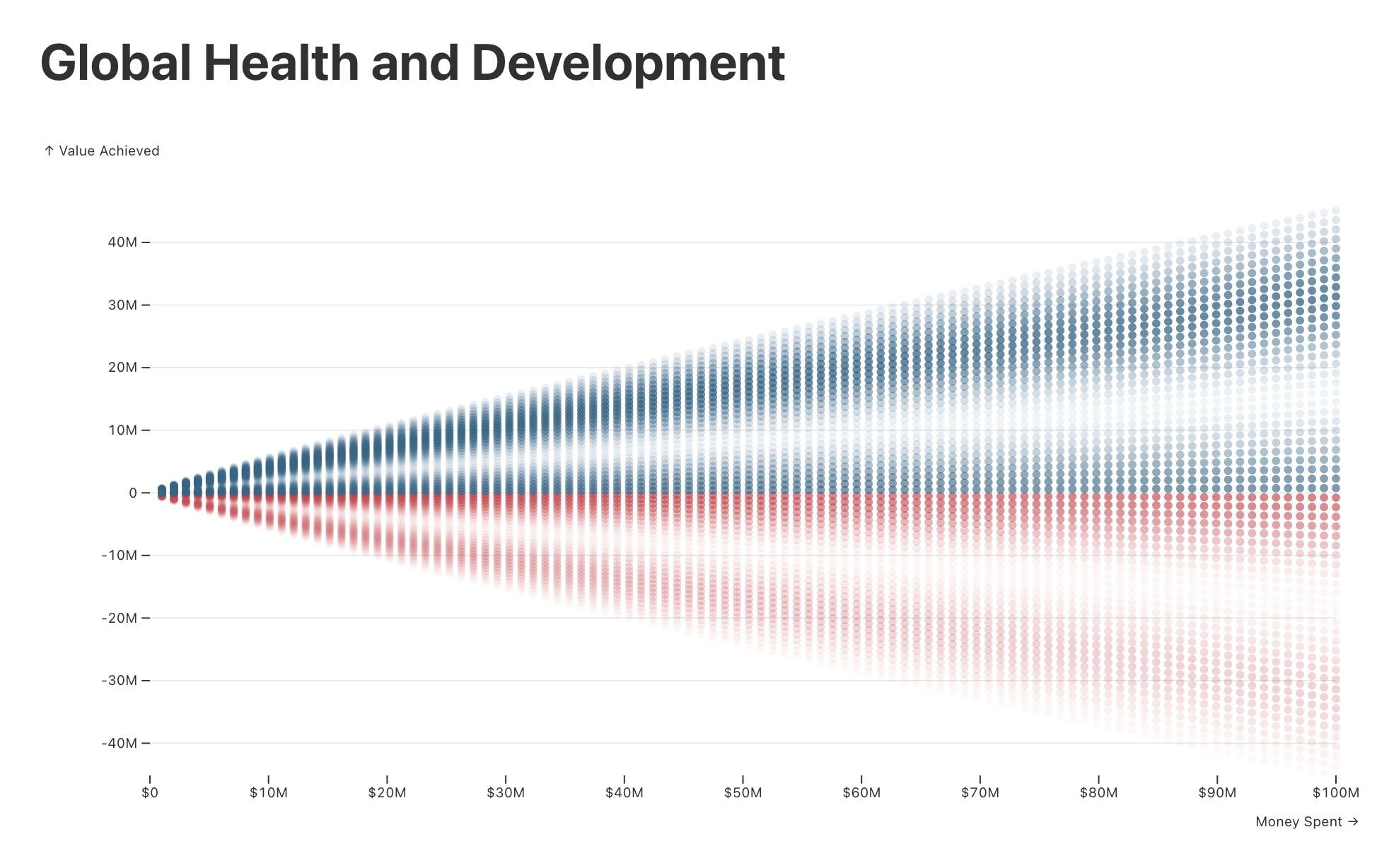 To make cost-effectiveness distributions easier to visualize, we provide shooting graphs for each cause area. These graphs plot the outcomes for any given amount of spending, with more likely outcomes shown with greater opacity. The tool’s graphs display all possible spending amounts, from $0 to your chosen budget. For ease of inspection, outcomes that achieve positive value are colored blue, while negative outcomes are colored red.