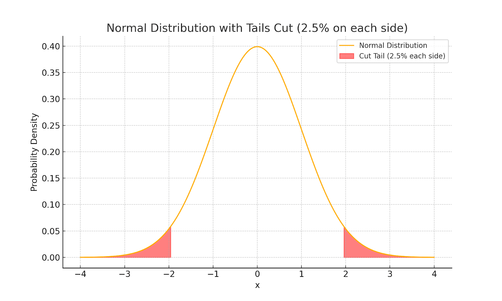 Tails-Excluded EV: An alternative method for incorporating risk aversion excludes very improbable outcomes. Outcomes are ranked by value to form a distribution, and the extreme tails, which represent the worst and best outcomes in the distribution, under some probability threshold, e.g., 0.5%, are cut out. It then rescales the remaining probabilities. In a normal distribution, this corresponds to ignoring the left and right tails.