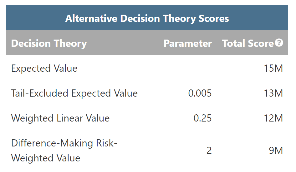 To begin experimenting with RP’s Portfolio Builder Tool, answer the four questions at the top of the tool’s homepage, select a decision theory, and hit “Build Portfolio”. If you’re an advanced user, you can also customize the parameters in more detail. To get a sense of the tool’s functionality, you can watch the walkthrough videos. If you come across any bugs, please share them here. We will update this document with some frequently asked questions.