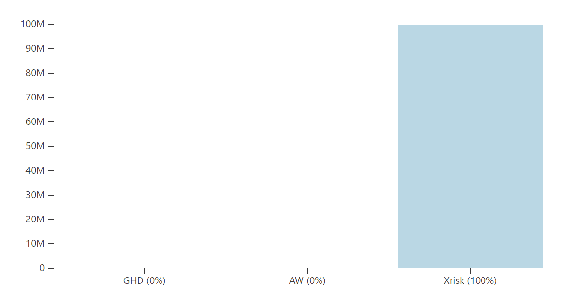 Note that the scale of the y-axis for existential risk (ranging from −250 billion to 250 billion) is enormous compared to that of GHD and AW (-20 million to 20 million). The disparity in scale observed in this example, can arise in many other cases, and is by no means exclusive to existential risk.