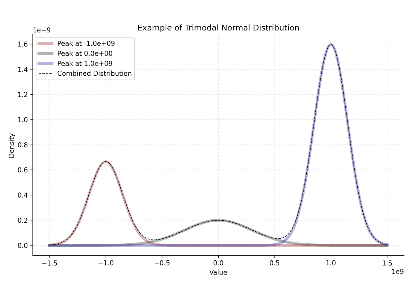 We achieve this by considering a distribution of possible outcomes, typically measured in DALYs averted, that could result from any given level of spending. There are many possible models and distributions we could use. To emphasize the qualitatively distinct outcomes, our default choice is a trimodal normal distribution. This approach adds some realism to a traditional normal distribution without introducing too many new variables or model components. It allows us to directly consider scenarios where the net effects of our spending might be futile or even negative.[4] For example, we might fund interventions for animals that turn out not to be sentient, or start an AI research institute that accidentally highlights dangerous capabilities in a harmful way. Below, you can see an instance of the trimodal model where we fixed the budget and assigned non-zero weight to the three peaks (that is, the probability of futile and negative outcomes is non-zero).