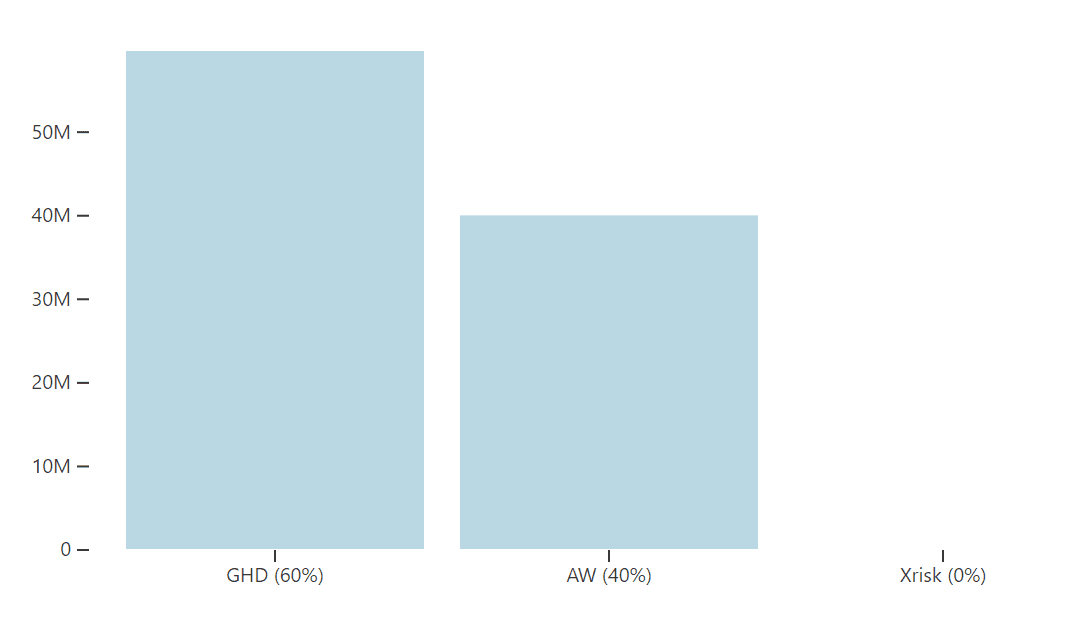 The tool’s insights reveal patterns that could significantly influence funding strategies. For example, while EV maximization can favor prioritizing existential risk mitigation, even slight risk aversion tends to shift allocations toward Global Health and Animal Welfare. By calibrating different inputs, users can refine their understanding of portfolio optimization, uncovering trends that should inform resource allocation.