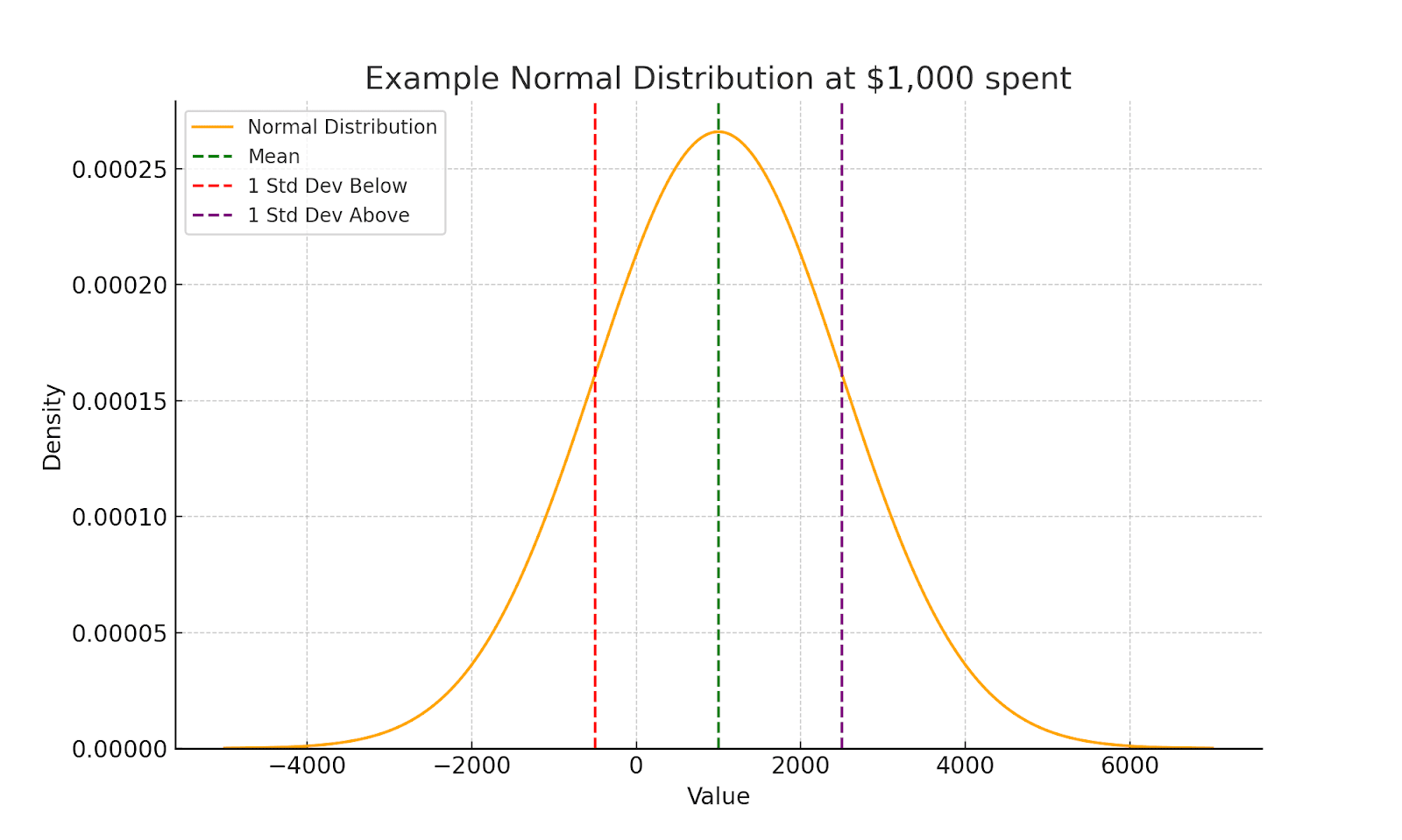 Fixing the amount spent at $1,000, we could also draw a familiar normal distribution to visualize the model’s behavior in more detail. We do this below.