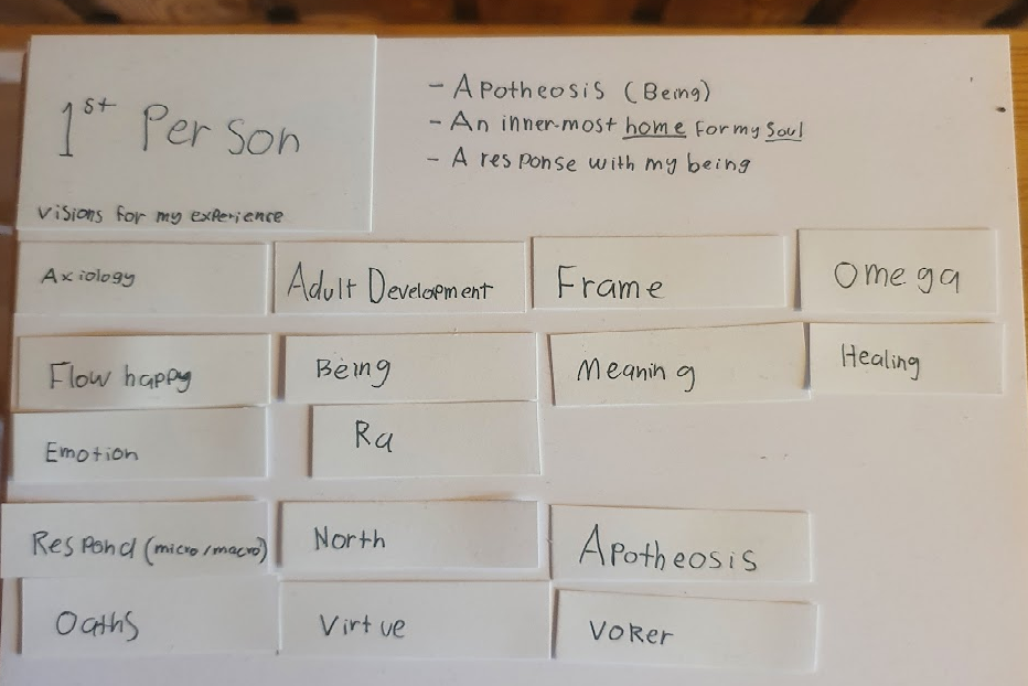 I came to understand a broad swath of my interests through the frame of this desire, I labelled it, Apotheosis. A path of asking what is good/important, what is true/real, and inviting answers to those questions to seep deeply into the fabric of my lived experience. To make of myself such a thing as begets more existence, more good, more truth, more of this.
