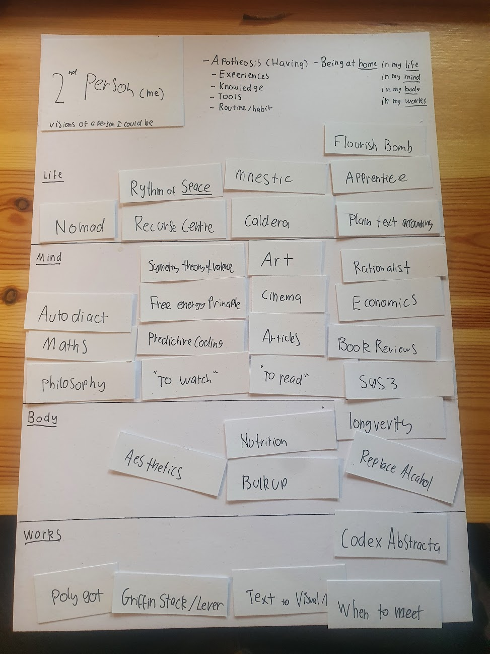 It was a great relief once all ~200 threads were either retired, or grouped with peers into clusters like “Eudaimonia”, “Voltron” (a metaphor for coordination) or “The Multi-Dimensional Crisis Revolution”. Even more so once I got a sense of how these clusters related to one another, and could fit into yet higher groupings. Eventually, after 3 weeks I’d built a set of framing ideas that gave me multiple angles through which to understand what mattered to me.