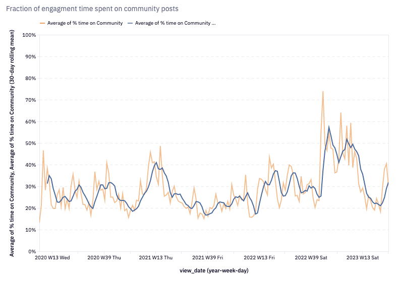 and here’s a graph of the percent of overall engagement that’s spent on Community posts (the blue line is a running 30-day average):