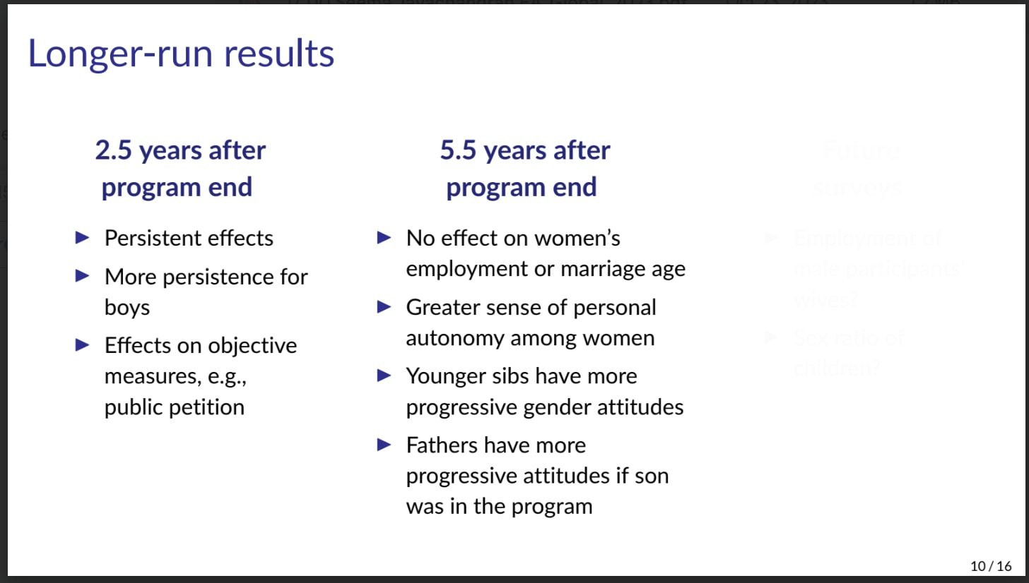 One aspect I’m not going into detail about in this talk, due to time constraints, is the concern that respondents might simply be telling us what they think we want to hear, rather than what they truly believe. To address this, we implemented various methods in the study to check for sincerity. Additionally, the persistence of these results gives me some reassurance. For the longer-term results, we also incorporated what economists call “revealed preference” measures, which are objective measures. For example, we had a public petition against the dowry system that participants could sign, with their names being published in the local newspaper. Signing this petition was somewhat costly, in terms of social exposure, so it required having some skin in the game. This helped ensure that the expressions of belief were genuine, as it was not just a matter of saying something pleasing to the researchers without any real belief.