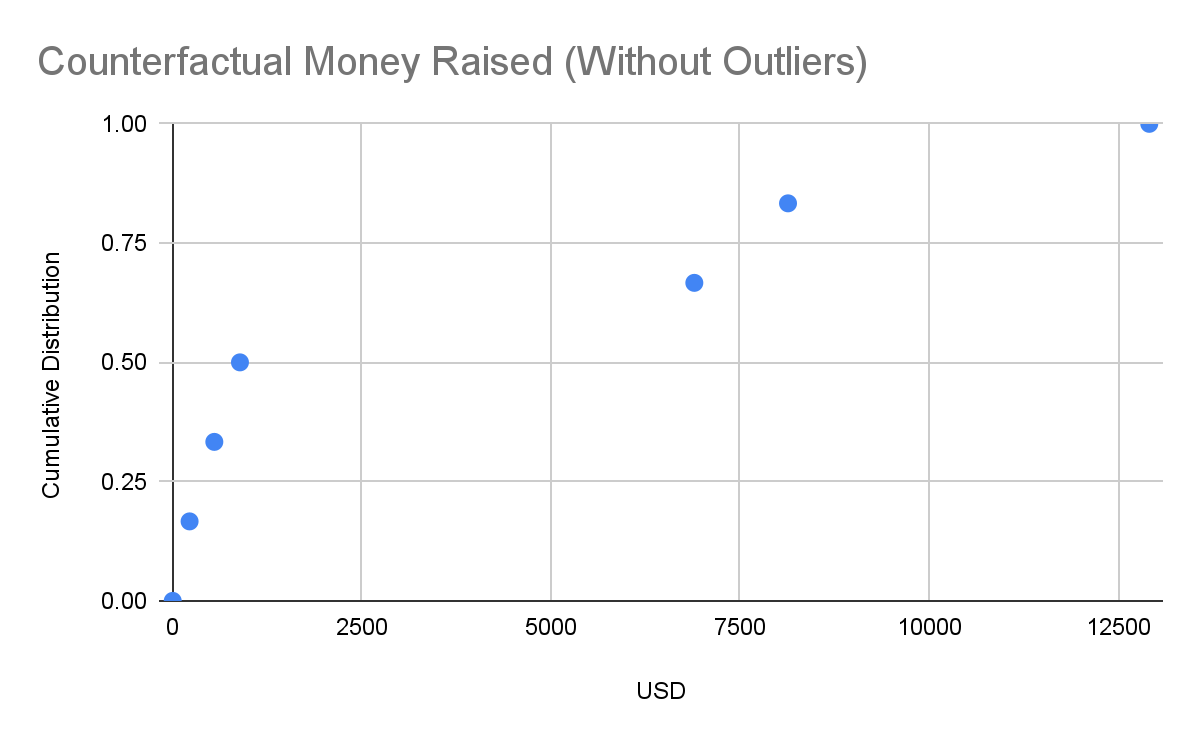 Feedback on the data analysis: I find the 90% confidence interval to not be very informative in some situations. For example in the case of “Computing the ratio of money raised to time spent, we arrive at an average of 786 USD per hour (CI 7 USD to 3,100 USD)”, the CI range is very broad and I only really take away ‘there was high variance in the data’ or ‘there weren’t many data points’ or both. In this situation, it’s both and it’s relatively clear to see from the figures.