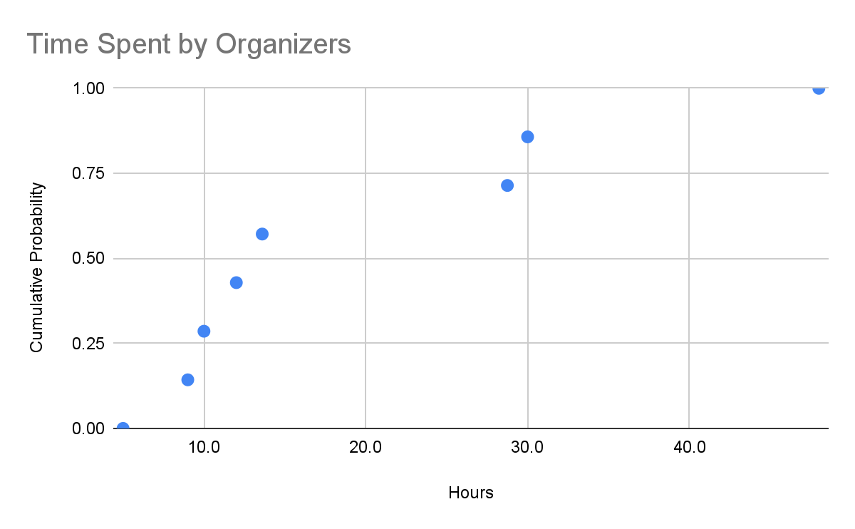 The main cost of the initiative is the time taken to organize the campaign. On average, organizers spent 20 hours on their events (CI 6 hours to 42 hours) and received 5 hours of support from HIP (CI 2 hours to 10 hours). The distributions are shown below.
