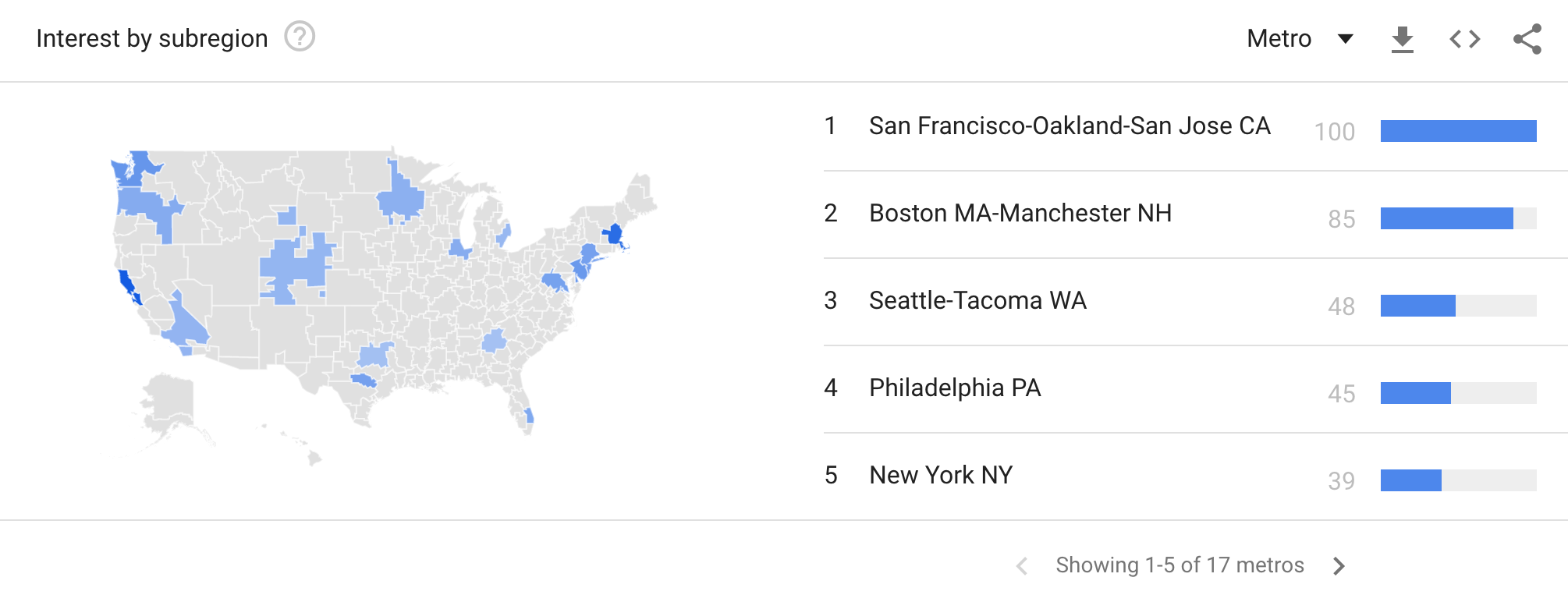 Interest since 2004 can be broken down into further subregions, highlighting the expected Bay Area hub.