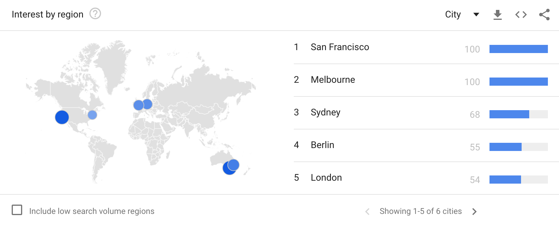 Looking outside the US… interest in “Effective Altruism” globally since 2004. By country, and by city. Again, the expected hotspots here. For those like jahying interested in growing EA in regions like Asia, Google Trends may be a nice tool to track efforts (if not already in use).