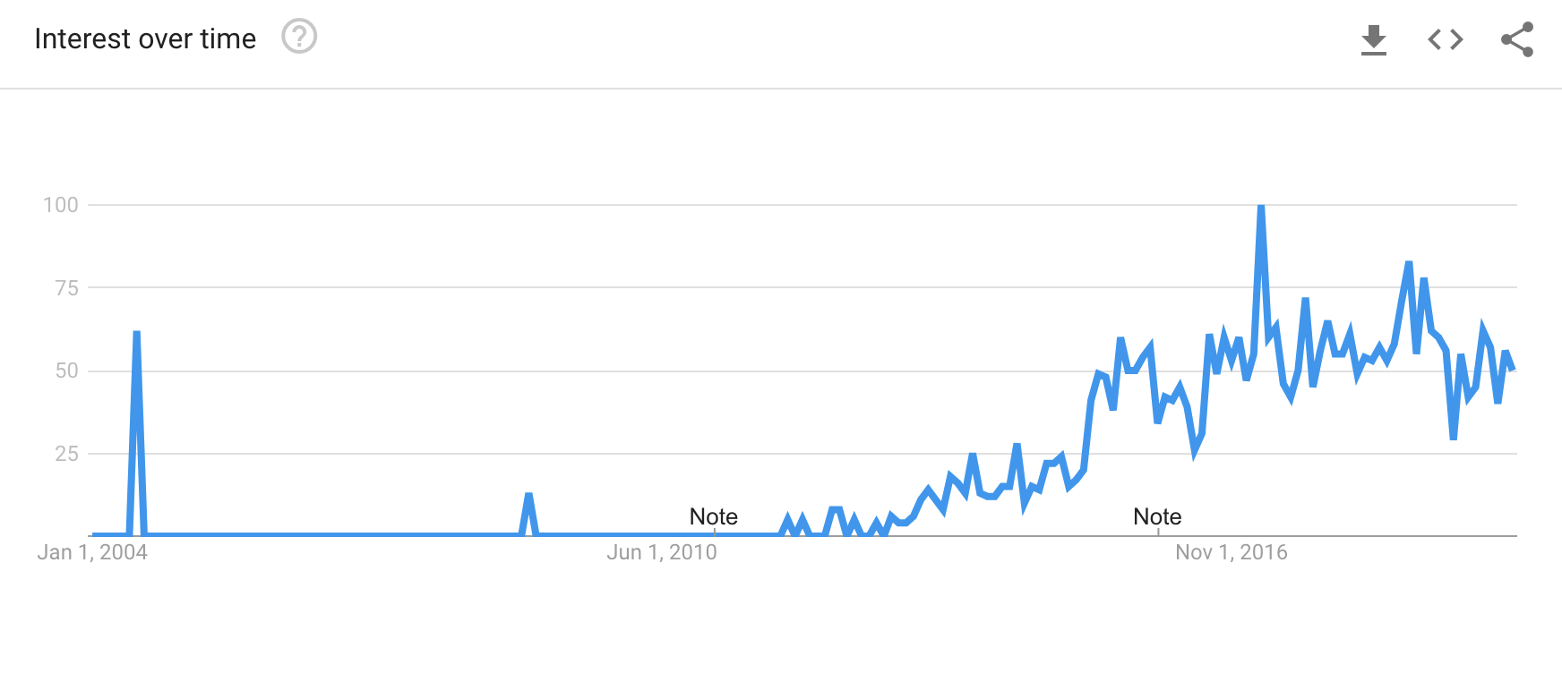 Given the timing of the “Effective Altruism” search peak (the week of March 12-18, 2017, if I’m reading my own graph right), I strongly suspect that it was caused by CEA’s tenure in Y Combinator, which is popular in a way philosophical movements very rarely are. (For example, this Hacker News post about the launch of EA Funds came out on on March 16.)