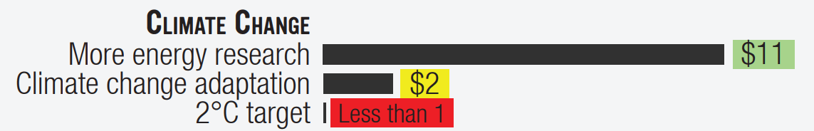 The Copenhagen Consensus Centre (CCC) estimated interventions to mitigate climate change are not that effective to boost economic growth. The prints below have the benefit-to-cost ratios for trade, health and climate change interventions[1].