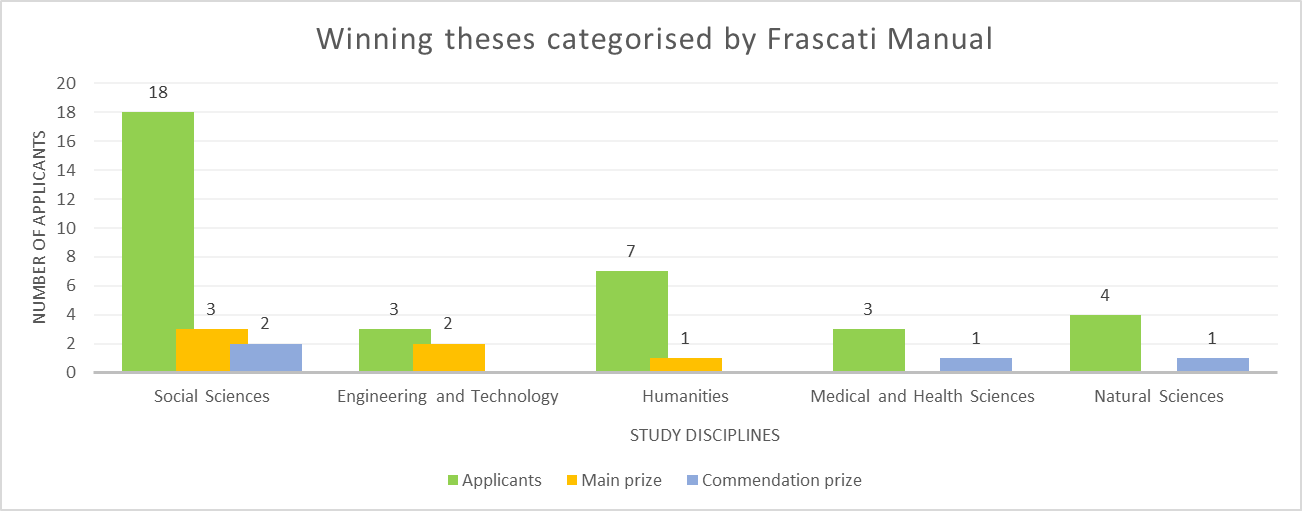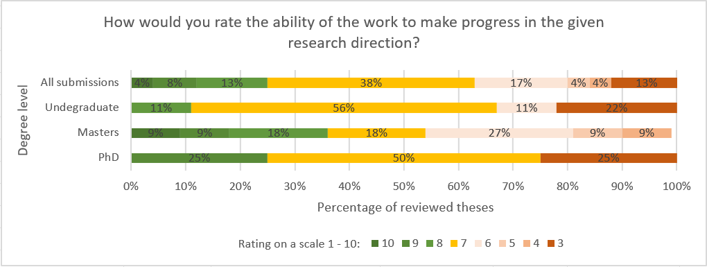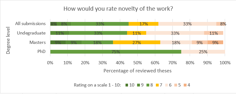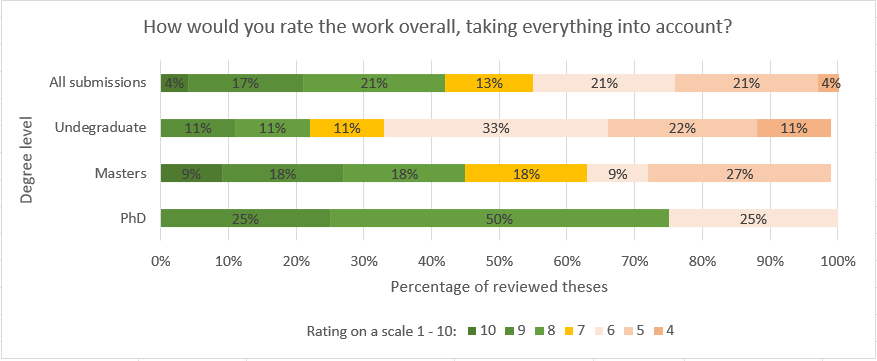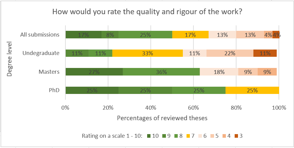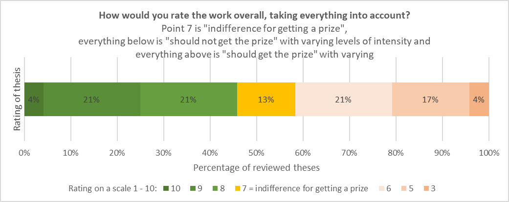 Taking all factors into consideration, 45% of reviewed submissions were recommended for a prize by their reviewer (score 8-10), but only one received the highest score possible (score 10). In 13% of cases the reviewer gave a score of 7, reflecting a neutral position on whether the submission should receive a prize. In 40% of cases the reviewer recommended against the submission receiving a prize (scores below 7), but on a scale of 1 − 10, even these scores were mostly positioned around the middle (6 or 5). Those results suggest that all submissions showed medium to high overall scores (5 or above; mean =6,9) when being compared to the thesis produced in the top ~20 programmes in a similar field.