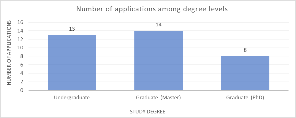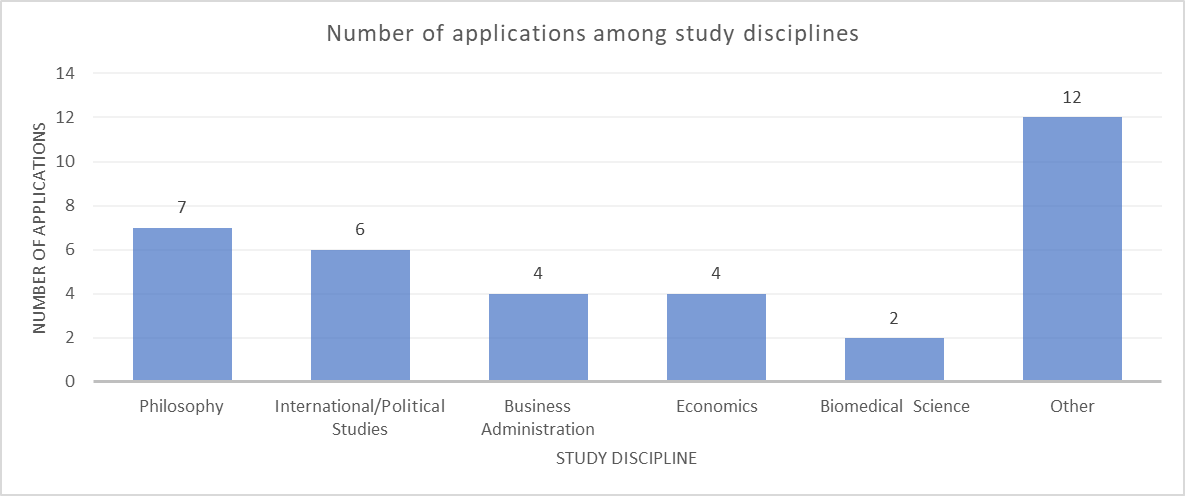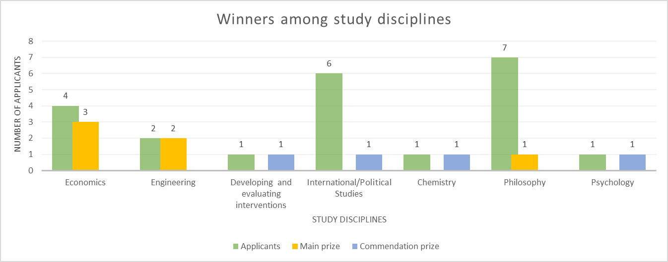 Out of 4 applicants with an Economics major, 3 won a main prize (2 at the Undergraduate level and 1 at the Master level), and both Engineering applicants were successful. On the other hand, only 1 Philosophy student won a prize despite Philosophy applicants being the largest group. We can see a similar pattern for students of International/Political Studies.