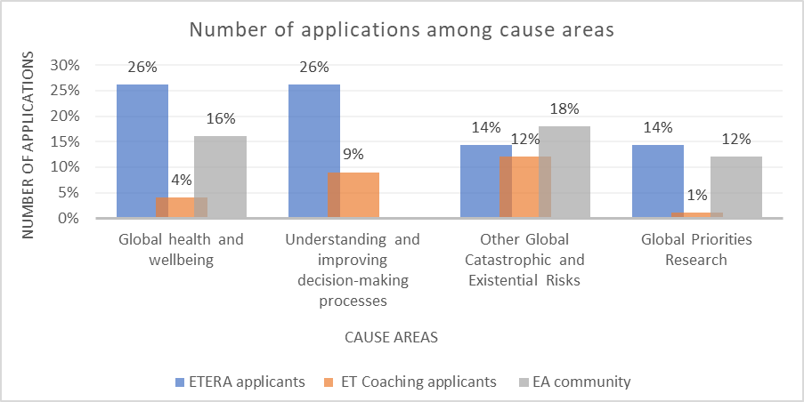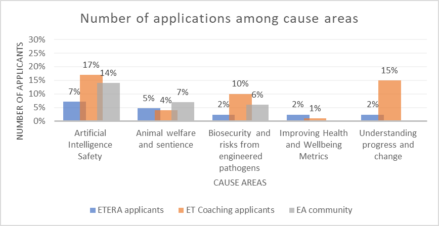 By cause area including Effective Thesis coaching applicants and EA community (sorted by ETERA applicants from highest to lowest)