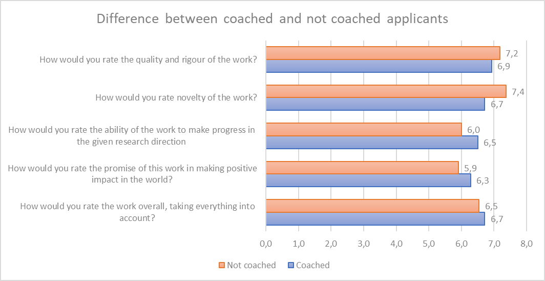 Submissions of non-coached students scored higher in quality, rigour, and novelty compared to coached students. On the other hand, submissions of previously coached students scored higher in the ability of the work to make progress in the given research direction, the promise of the work in making a positive impact in the world and the overall score. This might suggest that going through our coaching process helps students to come up with ideas that are more impactful. However, this is only indirect evidence—to be more confident, we could look into how helpful the coached students said the coaching was for them in our yearly evaluation.