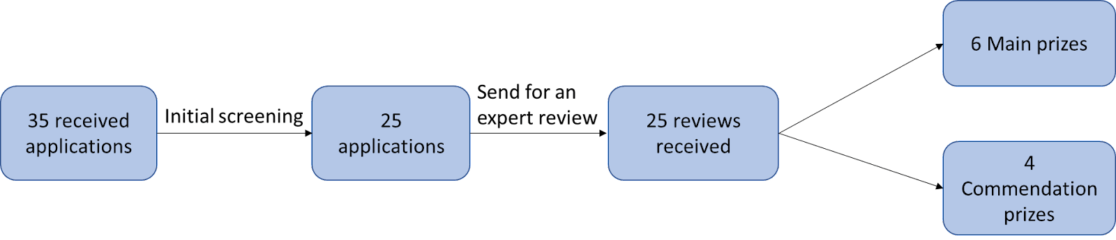 Reviewers assessed applications based on four criteria: (1) quality and rigour, (2) novelty, (3) the ability of the work to make progress in the given research direction and (4) promise of this work in making a positive impact in the world. Each reviewer also expressed the extent to which they recommended that the submission should win a prize. All reviewers were instructed to compare the thesis they reviewed with a reference group of “all undergraduate/masters/PhD theses in the top ~20 of programmes in their field”.