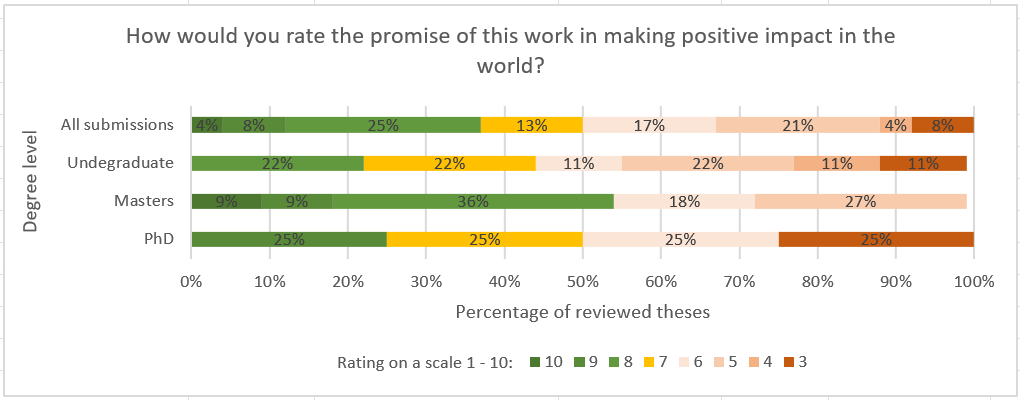 The overall ratings and scores for quality and rigour were generally higher for submissions at higher degree levels, but we should be aware that the distribution for the PhD degree level may be biased due to the small number of reviewed applications (4 submissions). Masters submissions scores are the best in the work’s ability to make progress in the given research direction and the promise of the work in making a positive impact in the world. PhD submissions excel in novelty.