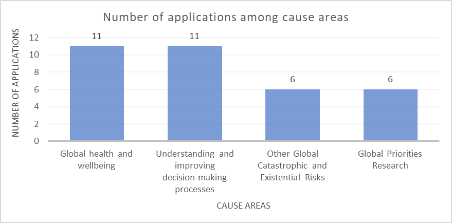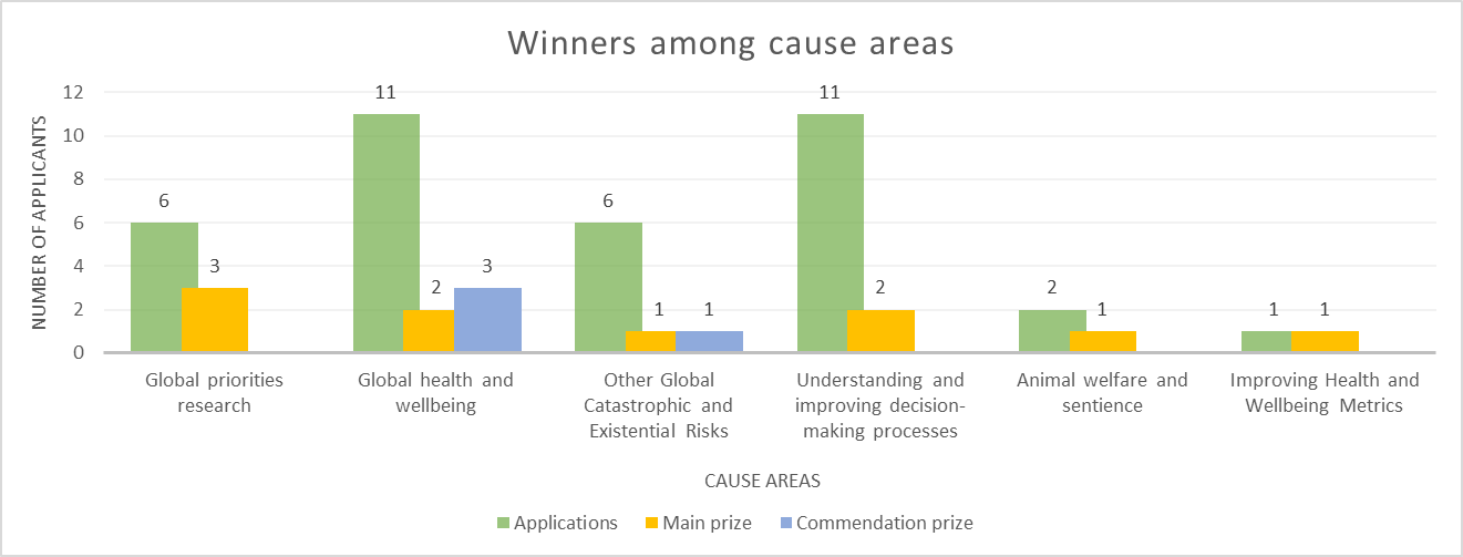 We received applications from across a variety of study disciplines and cause areas, though causes that have traditionally been prioritised by EA leaders—such as AI alignment, biosecurity, and animal welfare—were relatively underrepresented in our sample. It is unclear to us why this is the case (e.g. whether people working on those causes already have existing cause-specific prizes to apply to; or have different publication norms—like publishing mainly via blog posts—that our award is not compatible with; or to what extent some of these directions are not bottlenecked by the creation of new research ideas and understanding but rather by execution of existing ideas). We think this represents room for improvement in the future.