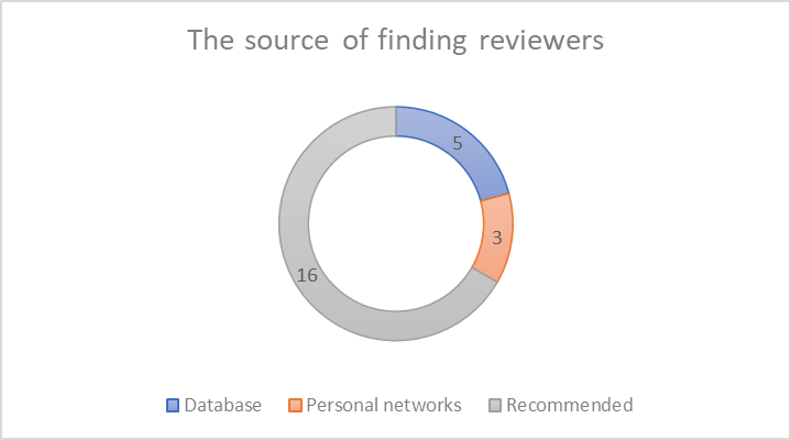 We learned of two-thirds of the reviewers through recommendations, which is the source we preferred as our knowledge and network in the relevant fields are limited.