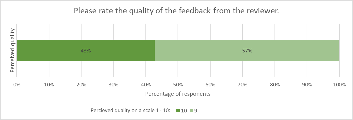 Overall, applicants reported finding the feedback from the reviewers helpful (mean = 8,2 on a 10-point scale) and high quality (mean = 9,4 on a 10-point scale). In an open-ended question, three applicants highlighted the quality of the reviews they received, two applicants mentioned good communication with award organisers, and one respondent appreciated receiving interesting feedback even though they didn’t receive an award.