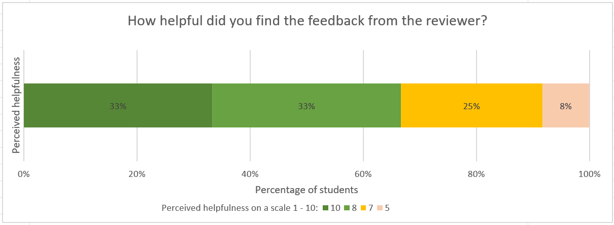 Note: The second question (“Please rate the quality of the feedback from the reviewer.”) was answered only by 7 respondents because it was added to the form later, based on a suggestion from one of the participants saying that “helpfulness and quality might sometimes score differently”.