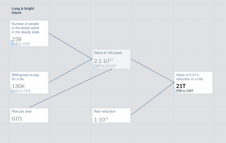 N=1010 (10 billion), X=$104, r=0.0001 means that willingness to pay for 0.01% risk reduction should be 0.0001∗1010∗$104/0.0001=100∗1012, i.e., $100 trillion