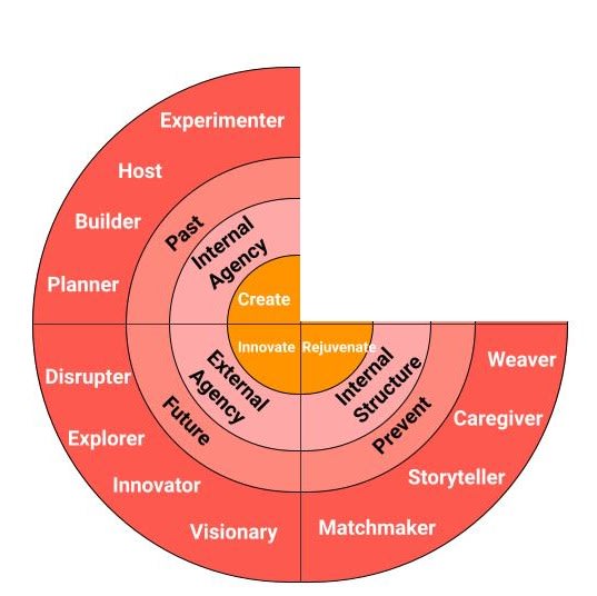 To Innovate for a community, is to explore and disrupt for future conquest. Innovate is based on future agency (actions). They seek bigger and better ideas and opportunities that don’t exist in the existing community and pursue them and share with the existing community. They have the most influence in where the community grows or stagnates for its long-term sustainability.